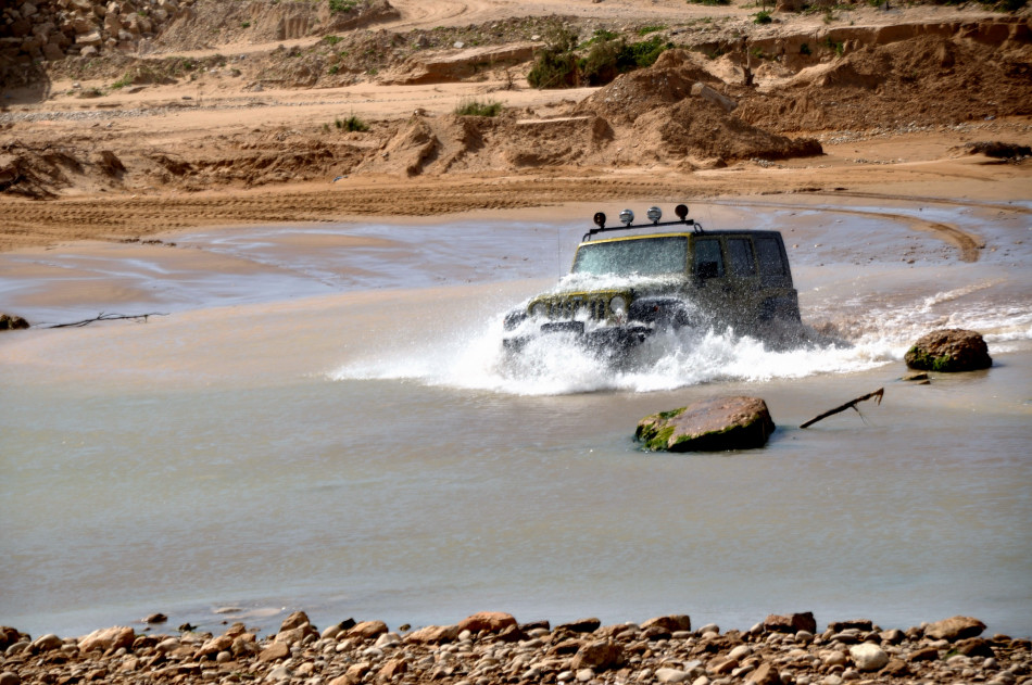 Antes de llegar a las dunas, que ya estaban a la vista, hubo que hacer un vadeo por el que no paraban de pasar unos camiones bestiales de una obra cercana. Llegué a la orilla, observé los vehículos que pasaban, puse el 4×4 por si las moscas, y despacito llegamos hasta la otra orilla para filmar al resto. Apenas apostarnos con la cámara, jairo estaba ya atrancado en un talud del que el Toyota no podía sacarlo por más que tiraba. Un camión que vió la escena al pasar, como si de la mano de Alá se tratase, le dio un tironcito con pasmosa suavidad pero enorme fuerza que le volvió a dar con las 4 ruedas en el suelo. Hay que ver el video para darse cuenta de lo que digo.