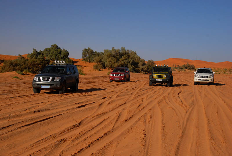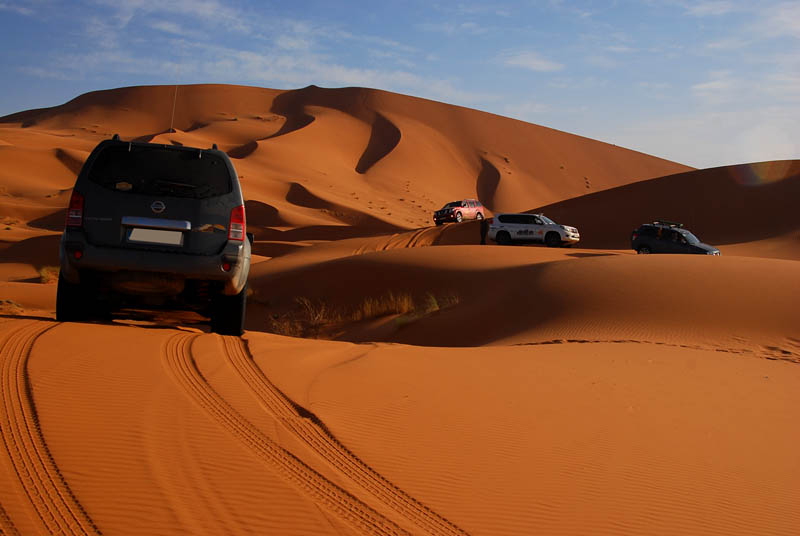 Este año Diana se ha tocado más tarde que de costumbre. Las etapas eran más relajadas, aunque nos encargábamos pronto de complicarlas para llegar tarde a los destinos. Pero eso no dejaba de ser la forma de llenar el día de nuevas experiencias. El Sábado, amanecíamos 4 coches y debíamos acostarnos 5. Se nos adosarían en torno al mediodía los del Suzuki, toda una duda entre tanto hombre porque aportaba al convoy dos chicas, y las bromas eran inevitables desde primera hora de la mañana. Allí, a las puertas del albergue de Erg Chebbi, preparábamos coches y personas para echar un día de arena casi en su totalidad.