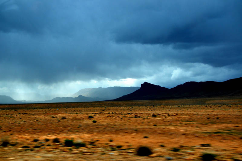 De Nador empiezas a bajar por una de doble carril en cada sentido que va dejando el mar atrás. Luego pasa a uno, y llegas a Guercif, que se atraviesa pronto, no tiene nada que ver. A partir de ahí, cruzas la autovía que va a Fes, desde Oujda en la frontera argelina, y entras en lo que es la verdadera interminable. Primero con buen firme, y luego peor, estrechándose y haciendo que empiezas ya a conducir «a lo moro», saliendo al arcén de tierra cada vez que te cruzas con un coche, mientras miras con recelo los dientes del asfalto roto de los bordes. Así, horas y horas, haciendo honor a su nombre, pero a buena media. Vimos nubes, que luego pasaron a lluvia y finalmente a torrenciales, pisando verdaderos mares al paso de las aldeas que iban ya anunciando que nos acercábamos a la nacional.