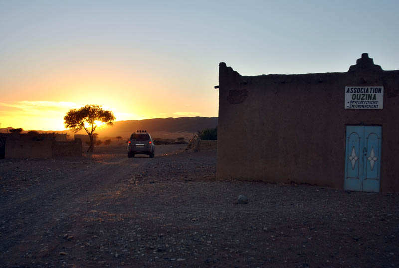 Tras unas fotos del atardecer en la aldea, seguimos los 5 kilómetros que nos separaban del albergue de Jordi para descansar en él. Su dueño llegaría un rato más tarde, pues había partido una barra de torsión del 100 teniendo que dejarlo en Merzouga. Las suspensiones en Marruecos es lo que tienen… Ya En el salón del albergue nos esperaba Moha y un riquísimo cous cous para terminar una jornada repleta, en la que finalmente descansaríamos mejor pues nos habían habilitado una habitación más de las que teníamos reservadas. Había que reponer fuerzas para jugar en la arena de Ouzina…