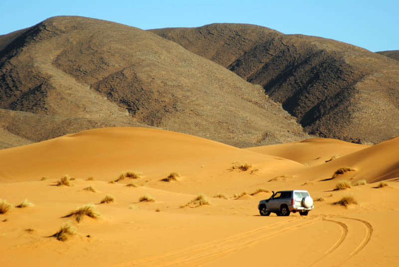 Esa mañana propuse no enredar demasiado, entrando otra vez en arenas y demás, porque era una etapa difícil de pronosticar. Entre otras cosas por el conocido paso del Remlia. De modo que iniciaos la marcha tras el desayuno rodeando el erg por el sur, y regalándonos la vista con unos colores que ni en otras partes de Marruecos se repiten. A los pocos minutos Lorenzo cantaba por la emisora que se habían dejado el neceser y les tocaba volver, hecho que aprovechamos para corregir las cuentas que habíamos errado al salir. Volvieron Luis Miguel y el mientras Carlos y yo les esperábamos haciendo fotos. Al rato estábamos de nuevo reunidos, con neceser, haciendo tomas de estas de grupo en un lago seco.