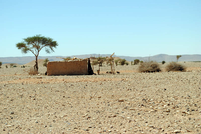 Cruzamos la llanura del accidentado del pasado año un poco más al norte del track, siguiendo un camión, y pasamos el pueblo en que lo atendieron. Pistas cada vez más rápidas, por las que agradecimos sobre todo que habían arreglado zonas pedregosas, hasta llegar a las obras de la carretera de Zagora, a las que subimos para buscar «desde lo alto» un sitio en el que comer.