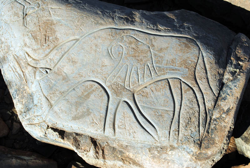 Fue en la salida en la que se supone que empezaba el asfalto, de hecho, en la que en tres cartografías diferentes indicaban una nacional. Allí, a la sombra de una palmera volvimos a hacer picknick con unos curiosos del lugar, y luego buscamos el susodicho asfalto… que brilló por su ausencia durante 15 kms, pedregosos y llenos de zanjas con una finalidad desconocida. Luego ya si, le gourmand, que nos empezaría a hacer Norte marcando el final por nuestras tierras del sur de este año. Con este medio, no tardamos nada en acercarnos al wpt de los grabados prehistóricos. Y cuando dimos con el camino, lo seguimos como investigadores hasta una aldea en la que preguntando llegamos, por fin, a una colina llena de piedras que eran testimonio de lo que había allí hace 5000 años. Impresionante.
