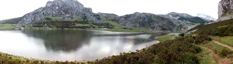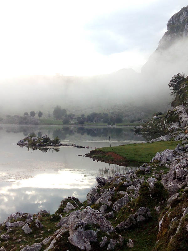 Daban lluvia. Pero no nos amilanamos y salimos en busca de la ruta qe tenía preparada por la zona de los Lagos de Covadonga. Quizás no era la mejor de Picos, pero sí un enclave al que me prometí volver hace tiempo, y hay que ir tachando lugares. Aunque como suele pasar, tras ir de nuevo te lo vuelves a prometer… pero esa es otra historia. Ahora rodábamos dentro de una nube por la carreterita que sube al Santuario de Covadonga, y como habíamos madrugado, éramos de esos pocos afortunados que pueden subir a lo largo del día en vehículo propio. Se notaba conforme ganábamos altitud que casi rozábamos ya el cielo, pero lo cierto es que los lagos presentaban un aspecto fantasmagórico. Era temprano, y al contrario de algunos que emprendieron el regreso, seguimos en nuestro afán, en esta ocasión ya a pata y rodeando el Enol, cuando empezó a abrirse un claro, más, más y… asistimos al espectáculo de una nube abriéndose en aquel entorno. El resto se puede ver en las fotos.