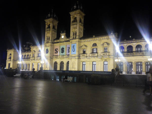 Una vez despedidos y tras montar, quedaba hacer la primera visita de Donosti. Comenzamos por la playa y un edificio que nos llamó bastante la atención desde lejos, que luego resultó ser un seminario. Así que retomamos el camino correcto ya con la moto y postpusimos al otro extremo de la concha para hacer algunas fotos por el ayuntamiento y en especial a la puesta de sol. Finalmente nos adentramos en la zona de pinchos, y viendo el percal como decimos en el sur, decidimos entrar en un garito de gente jóven que se veía bastante nuevo. Allí nos quedamos a cenar, lo cuál como comprobamos al día siguiente fue un acierto…