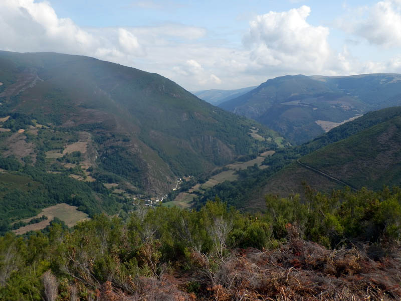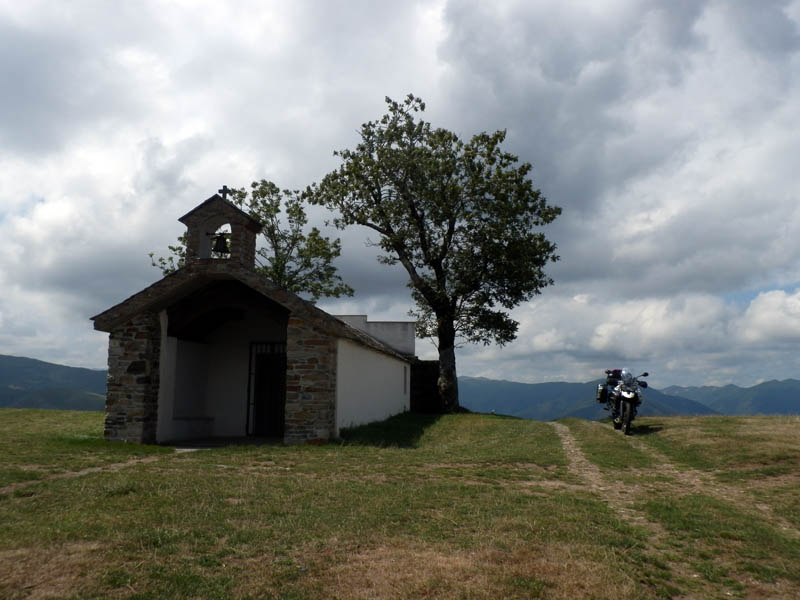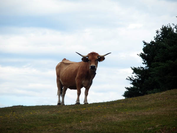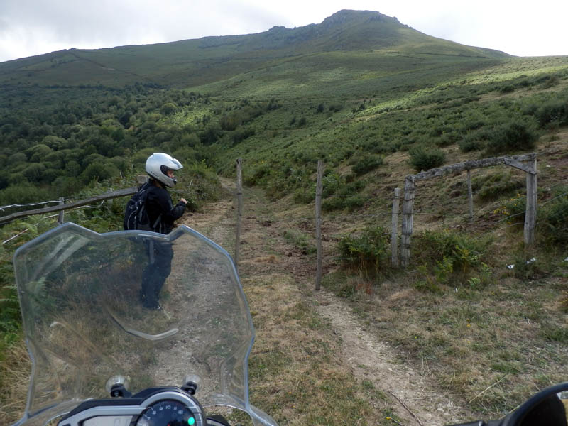 Tras recoger en el camping, durante la que quizás fue la noche más fresca del viaje, hicimos norte para entrar en Asturias en dirección al bosque de Moal, zona de osos en la que íbamos a hacer un pateo entre ayas, castaños y avellanos. Allí me contactaba Luis, un poco in-extremis como suele ser él, dos días antes de que pasásemos por su tierra. Todo iba según lo previsto, y tras el almuerzo de media mañana, teníamos tiempo de sobra para llegar al final del recorrido, en el Valle de Lago. Así que enfilamos por el «atajo» que había dispuesto desde casa, que nos evitaba hacer una «V» bestial hacia el norte. Camino vecinal, aldeas… pista… y valla de ganado. Sospechoso. Pero en el mapa salía claro. Estábamos a 3 kilómetros de la carretera principal, aquello tenía que estar conectado. Si no, los del pueblo de al lado nunca verían a los de allí abajo, ¿no? Pues no. Debían de estar peleados. Después de que Ana se apeara nosecuantas veces de la moto para cruzar un barrizal, la pista desaparecía de las más traicionera de las formas. Tocaba volver. De nuevo en la explanada del ganado, decidimos probar otra alternativa antes de rendirnos, que, esta vez sí, pero no sin dificultades, nos llevaba a la carretera. El atajo nos había ocupado dos horas, de manera que llegábamos al restaurante exhaustos, que es la mejor manera de llegar a un sitio de Asturias para comer; es decir, con mucha hambre.