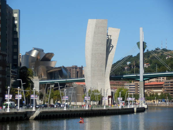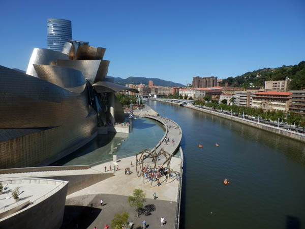 Esa mañana volvimos a desmontar para dirigirnos por fin a tierras vascas, el último asalto de nuestro trayecto, a lo largo de 5 noches repartidas entre Mundaka y San Sebastián. La lógica impuso ver antes Bilbao, que nos cogía de camino, y volvimos a sacar partido de la ventaja de viajar en moto aparcando enfrente del Gugenhein. De hecho, allí nos cambiamos el traje de pingüíno para andar ya cómodos por la moderna y cuidada ciudad, así como por su zona de casco antiguo en la que nos comimos unos pinchos, buscando lo típico y lo conocido, cosa que nos salió más barata de lo que esperábamos.