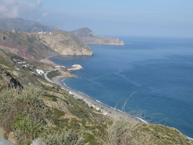 Solo conocíamos el tramo de costa entre Martil y Oued Laou. Ese fue uno de los motivos de planear está bajada. Curvas divertidas, asfalto rizado pero con buen agarre, y sobre todo, unas vistas fantásticas al Mediterráneo, con fuertes acantilados y pequeñas playas. Pero había mucho más hacia en Este, y queríamos descubrirlo.