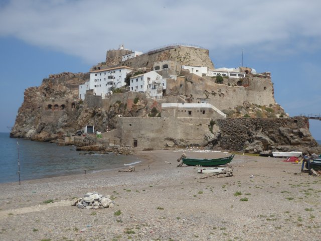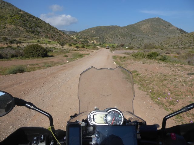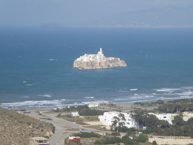 Decidimos emplear el domingo en recorrer la parte de costa al Oeste de Alhucemas, retrocediendo un poco sobre nuestros pasos y adentrándonos en el Parque Nacional. Las vías de comunicación resultaron ser pistas sencillas, que a dúo y sin las maletas laterales no plantearon problema alguno. Pueblecitos verdes, calas oníricas, islotes y una tortuga que cruzaba despacito a nuestro paso, nos acompañaron durante la mañana. Nos acercamos al peñón de Vélez de La Gomera. Un curioso emplazamiento aún español, que desde el terremoto de 1930 paso de ser isla a ser península. En su interior, un conjunto de casas y pabellones militares agolpados contra la roca y algún soldado que nos miraba aburrido. Más simpático resultó ser el cabo que había en aquel entonces nuestro lado, y que nos explico en francés que no había mucha comunicación entre ambas partes, y que a los españoles se les abastecía en barco y helicóptero.