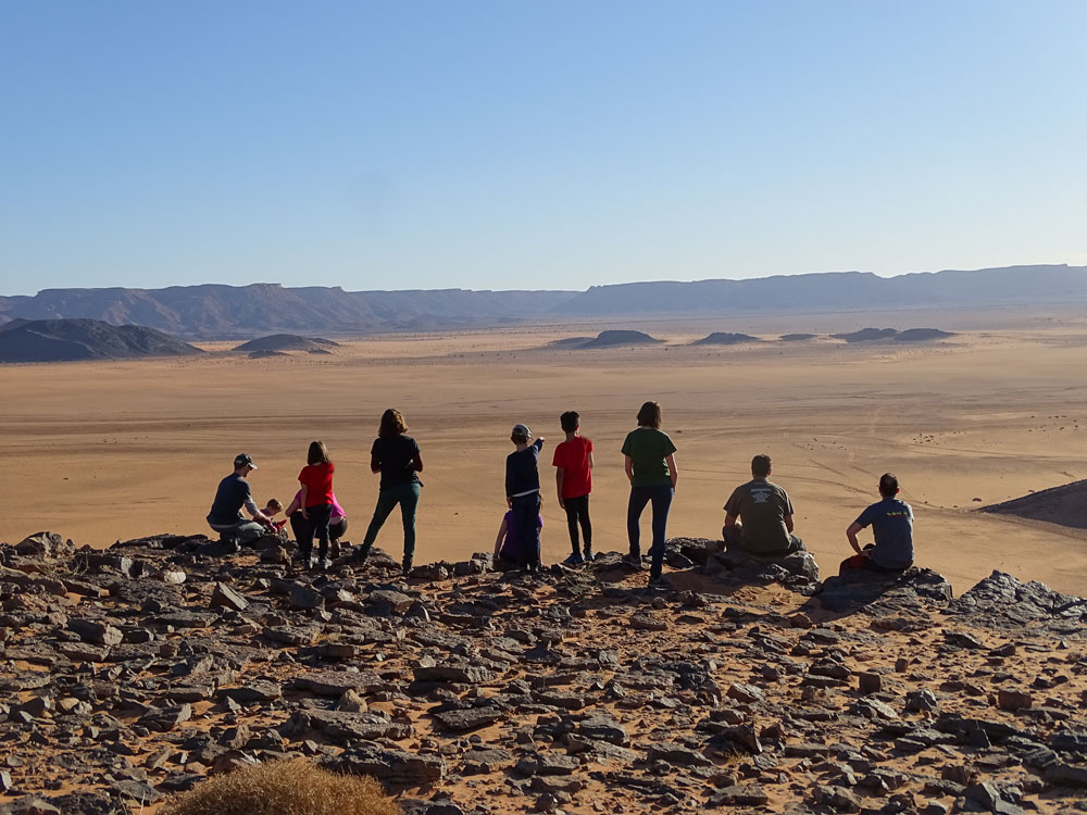 Estábamos al norte de las montañas negras que hacen de telón de fondo al desierto de Oubira, y que tantas veces hemos fotografiado en el pasado. Conocer «qué había entre bastidores», detrás de ese escenario tan trillado, era algo casi necesario. Al fin y al cabo, era el hilo conductivo de este viaje, descubrir cosas cerca de los sitios que tanto conocíamos. Exprimirlos. Pero ahora tocaba rodear al sur para llegar a Ouzina, nuestra meta del día. Lo bueno es que no fue difícil seguir paralelos entre pistas de minas, hasta encontrar el aso, también un poco arenoso, que salía al Albergue Ouzina TGM, conocido de otros años y al que no hemos podido ir por haber perdido el contacto con los amigos de allí. Luego, pista hasta el Porte du Sáhara. De camino encontramos al resto del grupo, tomando café bajo una acacia, que ya había tomado posiciones en el albergue. Echamos un rato con ellos y de allí y a descansar, deleitándonos con las hospitalidad de Musta. Te de bienvenida, como es rigor, frutos secos, pastas… Los peques aprovecharon para echar un partido de fúlbol con niños de Ouzina que solían acercarse por las tardes a ver quién llegaba hasta el albergue, que es el más próximo al pueblo, y nos reímos con ellos al presentarnos, ante el hecho de que todos los chicos se llamaban Mohamed.