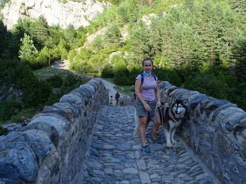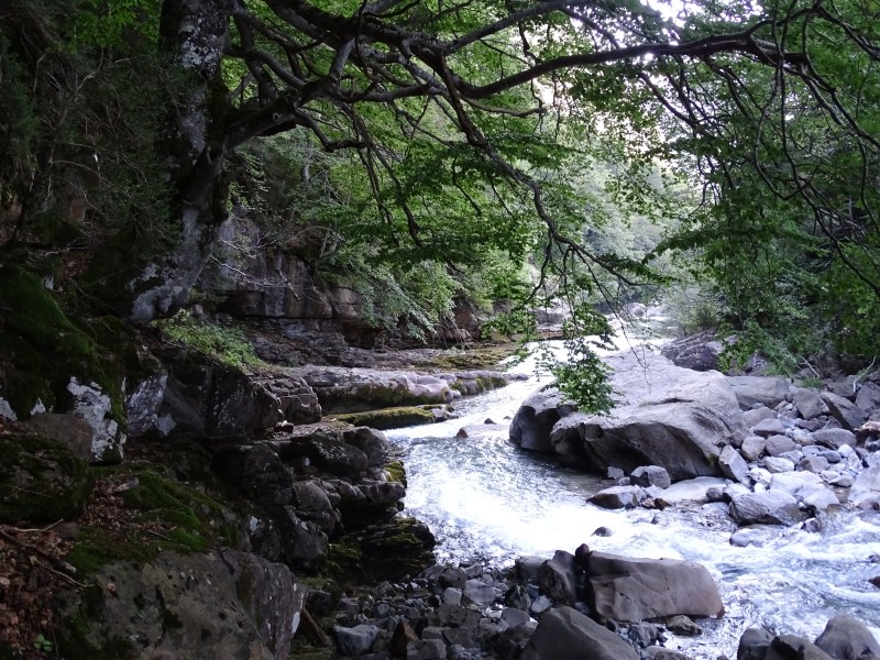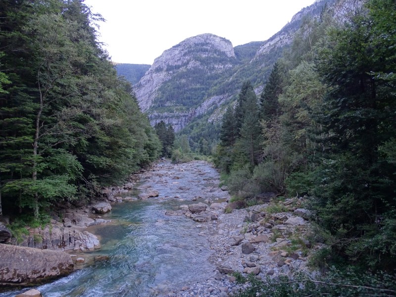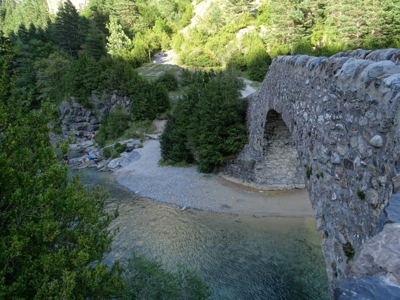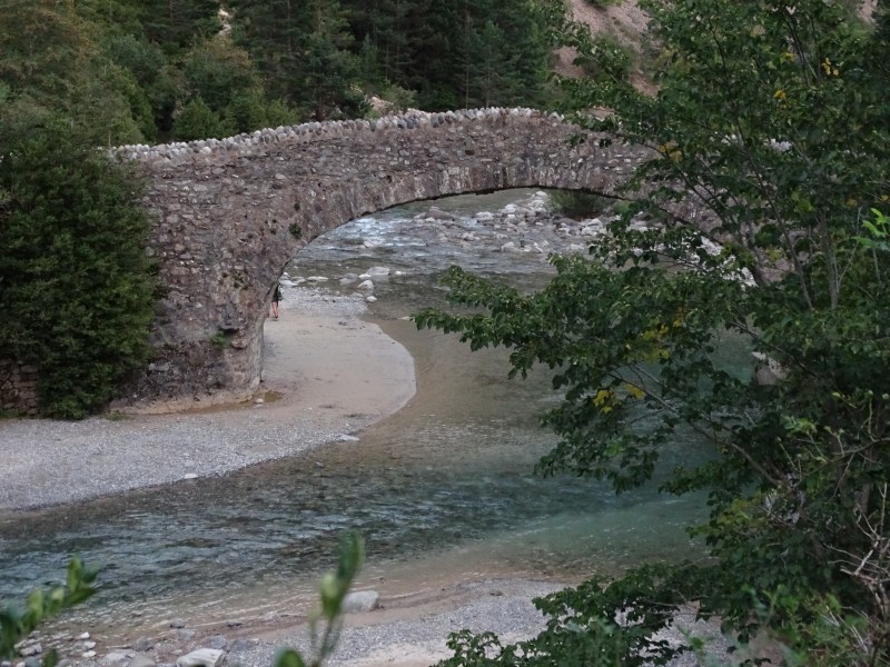 Además de estos edificios de piedra, testigos de tantas historias, en los alrededores encontramos un sencillo camping y muchas cosas que visitar. Segundo destino después de Ordesa, lo que veíamos nos invitaba a prolongar nuestra estancia y al menos visitar los principales atractivos de la zona durante los siguientes días. La tarde del día 20 quisimos ya aprovechar las últimas luces, ayudados por lo poco que tardamos en montar, para hacer el sendero que une el puente viejo con el puente nuevo, a orillas del Ara. Bajamos por la orilla izquierda, y subimos por la pista de acceso en vehículo, simplemente por variar, aunque la vereda tiene muchísimo más encanto.