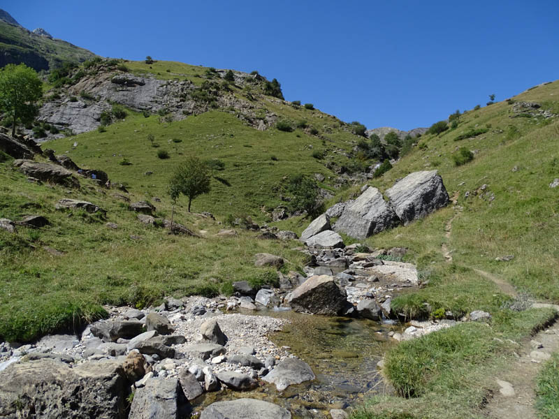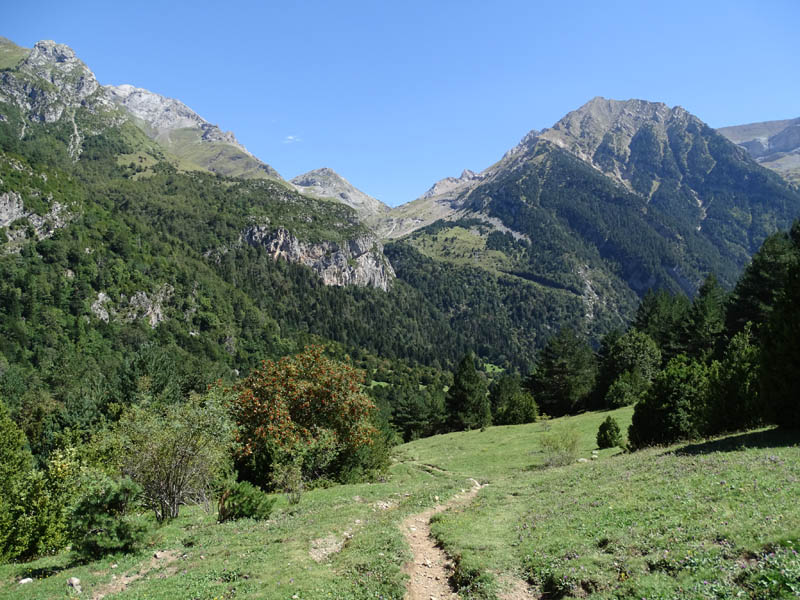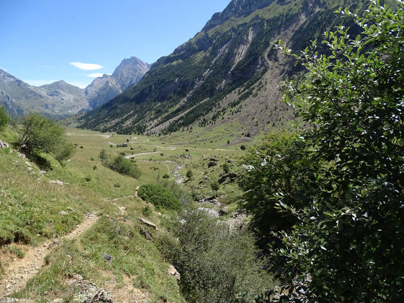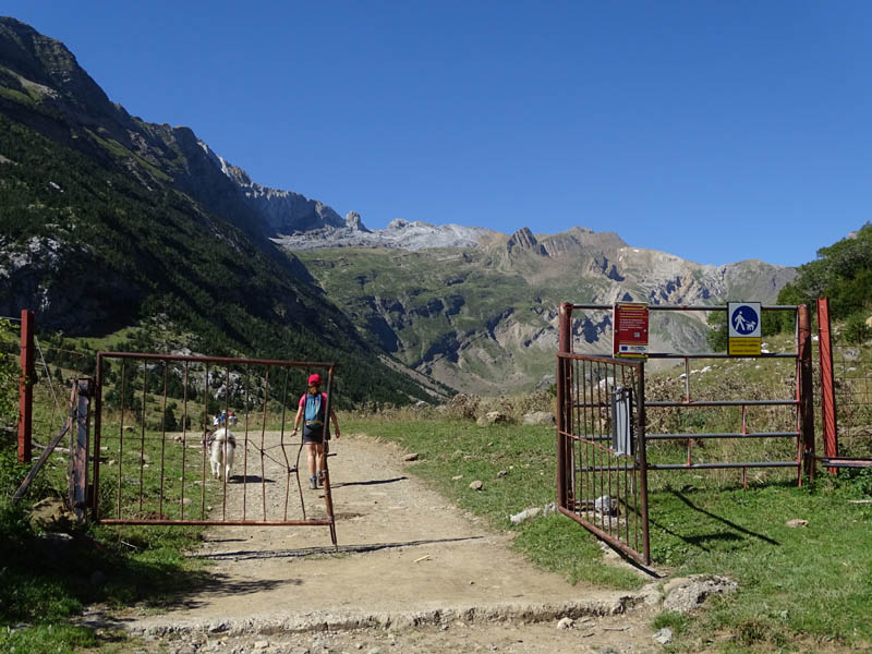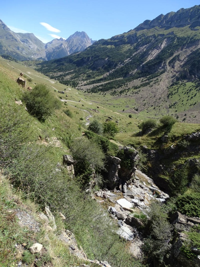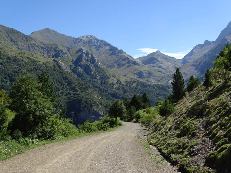 La primera excursión de media jornada que hicimos por Bujaruelo fue la que nos acercaba al valle del río Otal. Este, desemboca en el Ara desde el Oeste, y tiene la particularidad de ser una excursión muy asequible porque al haber explotaciones ganaderas, podemos hacerla por una pista forestal. Pero también hay la opción de subir por sendero, lo cual suele ser más fresco en verano, por poseer más áreas sombreadas. En cualquier caso es una excursión que empieza subiendo desde Bujaruelo por la orilla Oeste del río Ara, hasta un cruce en el que parte nuestra pista. Junto a una fuente, comienza el ascenso propiamente dicho, ya que hasta ese punto la subida es casi nula. Ascenso que corona en el collado en el que encontraremos una valla de ganado, y unas magníficas vistas sobre el valle, que vuelve a ser bastante llano, hasta la zona de las cascadas. La excursión no tiene más de 10 km de ida y vuelta, y en ella disfrutaremos de las siguientes vistas: