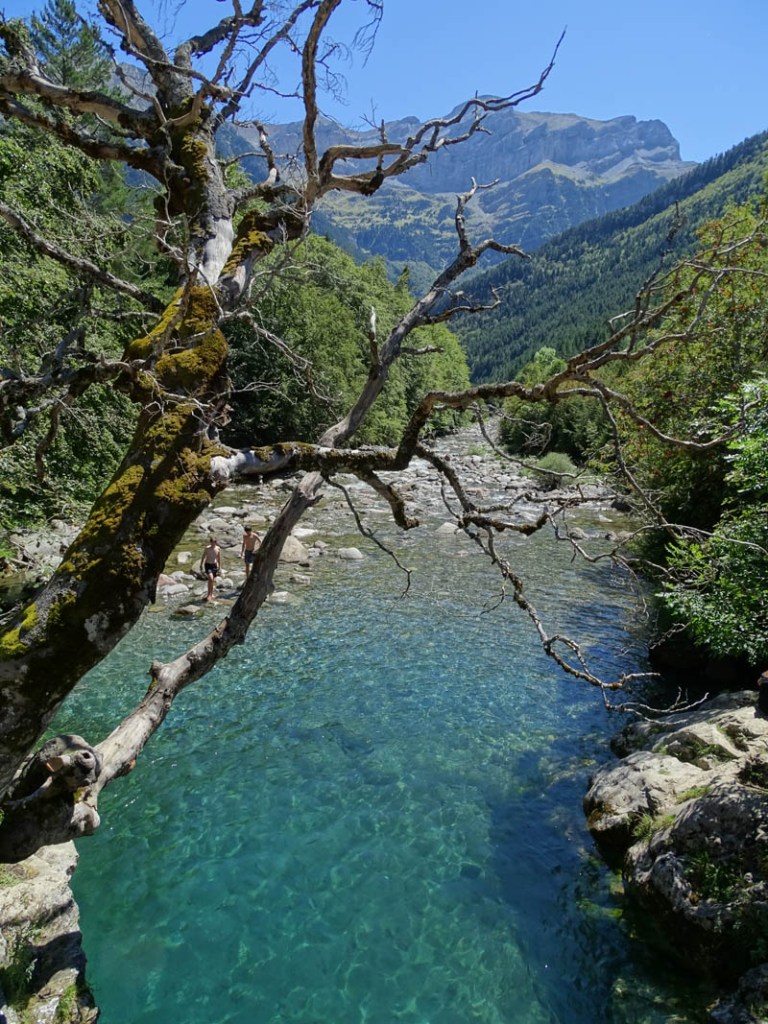 Ese río que debieron ver los peregrinos que cruzaban el puente de Bujaruelo desde Francia en dirección a Santiago, se llama Ara. Es un río que se nutre de las importantes masas calizas que hay por la zona, donde podemos encontrar incluso glaciares como el de Monte Perdido. Lo que significa que es un río con buen caudal, incluso en verano. Y es lo que comprobamos el 22 de Agosto en esta excursión.