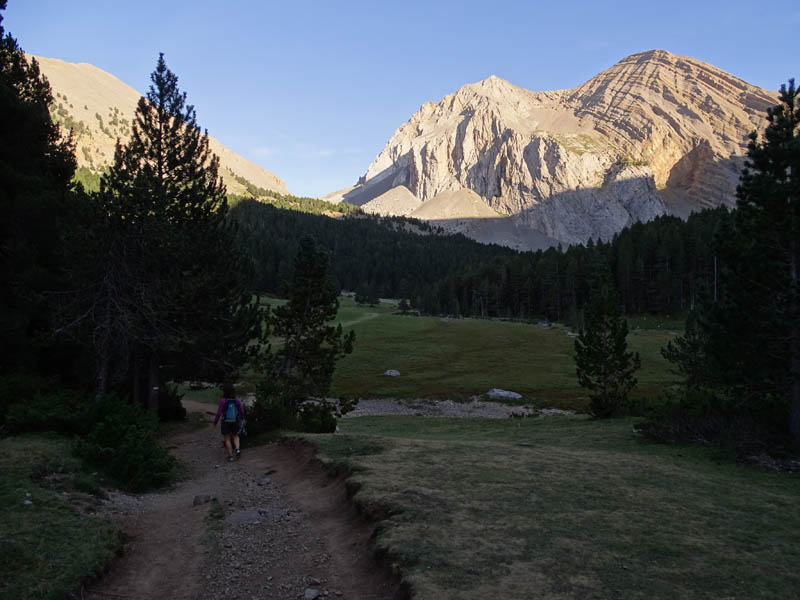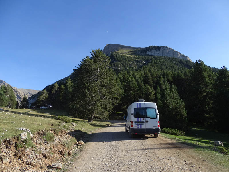 De camino al valle de Pineta, y pasado Ainsa, decidimos asomarnos a la carretera de Plan, para acercarnos a los alrededores del parque Natural de Posets Maladeta, donde ya visitamos hace años el Precioso Ibón de Escarpinosa; pero esta vez desde el lado opuesto a Benasque. Y aunque la idea era ver Plan y seguir nuestro camino, estando allí nos llegó la sugerencia de subir a su ibón, y decidimos hacer noche, animados por una zona en la que no había restricciones y sí algunas autocaravanas, sobre un antiguo campo de fútbol.