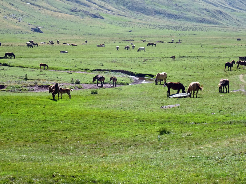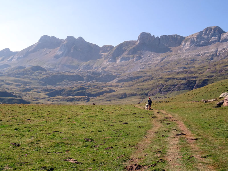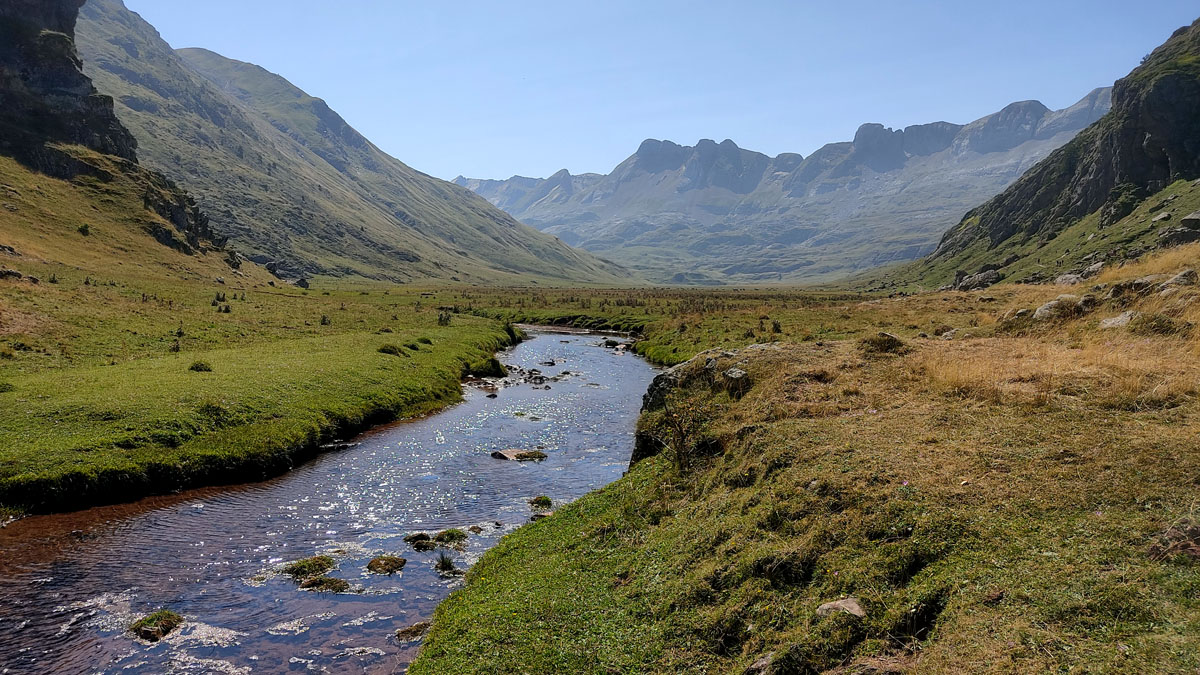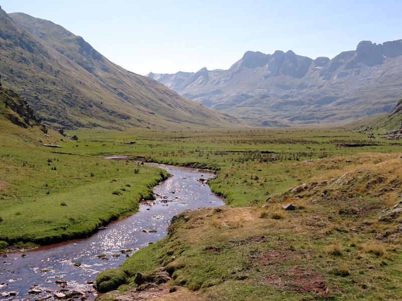 En el centro, el río Aragón nos escenifica la poca inclinación del terreno, haciendo meandros sucesivos. Y en ese punto se inicia una vereda por la vertiente oeste del Valle que va bordeando la ribera, para dejar tranquilos el millar de herbívoros (vacas y caballos) que pastan con total tranquilidad junto al agua. Son un par de kilómetros de absoluto disfrute hasta la cabecera, momento en el que se inicia otra subida para llegar al Ibón de Estanés. La ruta es lineal, andamos hasta donde queramos, y luego regresamos. Nosotros quisimos hacerlo por la orilla Nordeste una vez bajamos del refugio, al otro lado del río, para evitar la pista forestal, pues hay vereda también allí. Dejo las fotos, y os animo a conocer aquello.