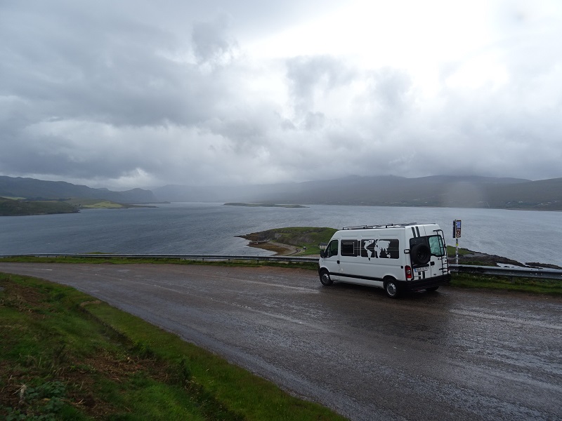 Seguimos hacia nuestro destino, el cabo John O´Groats, el pico nordeste de Escocia. Como íbamos bien, la idea era recortar unos kilómetros a la etapa siguiente, que consistía en bordear toda la costa norte y descender hasta el Loch Maree. Así que fuimos haciendo las paradas que el paisaje nos pedía. Habíamos reservado en un restaurante con muy buenas valoraciones que estaba más o menos en el centro de la cornisa norte, y nos lo planteamos como destino del día, animados por el hecho de que recomendaban un aparcamiento que estaba justo al lado para pasar la noche.