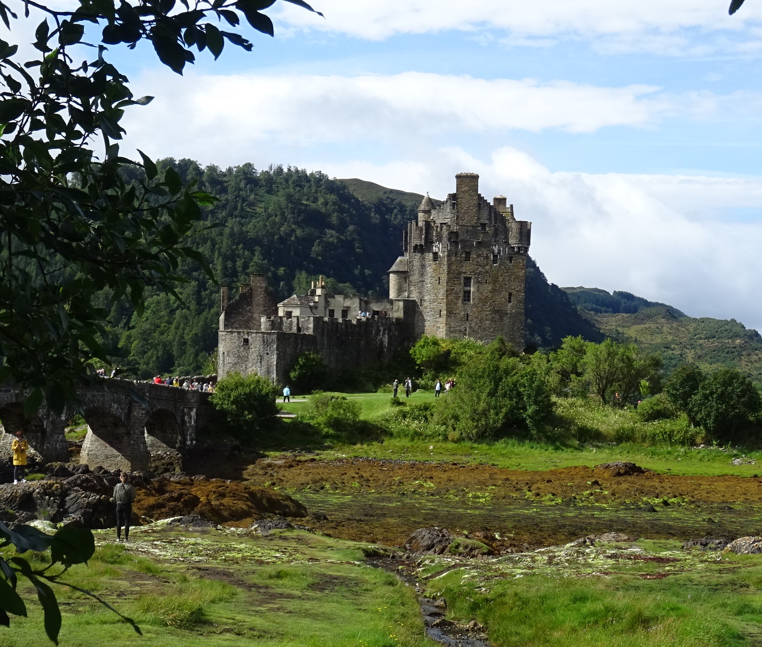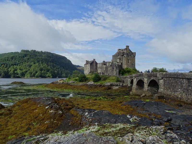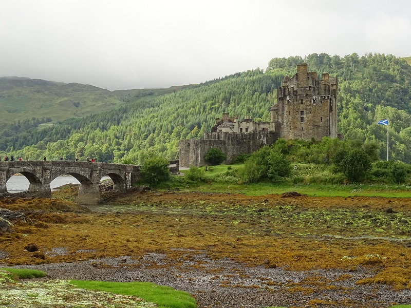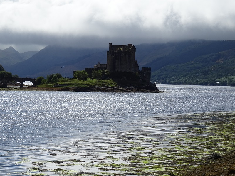 Salimos casi con pena del Loch Maree, porque habría dado para mucho más tiempo, pero el destino de hoy era el plato fuerte de Escocia, y teníamos también cierta impaciencia por alcanzarlo: La Isla Sky. Quizás la parte más turística del país, cosa que nos daba cierto recelo porque no queríamos encontrarnos las marabuntas que habíamos sufrido en los Pirineos durante los veranos Covid. Así que con cautela e ilusión a partes iguales fuimos avanzando la apretada jornada que teníamos por delante. La primera parada del día era un best Seller: El Castillo Eilean Donan. Allí sí topamos ya con una pequeña multitud de paisanos, pero en el límite de lo sostenible.