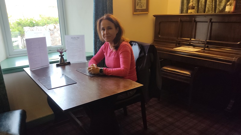No nos pidieron el pasaporte, se limitaron a chuparnos la furgoneta mientras Sialuk ladraba escandalizada ante el hecho de que nos lo tomásemos con tanta parsimonia. «¡Se os está contagiando la flema inglesa!». Poco más adelante llegábamos a nuestro destino, un restaurante/hotelito verdaderamente bien atendido y con comida casera, deliciosa. Los dueños, un matrimonio, habían vivido en varios países, entre ellos la India y Argelia, y se habían traído de allí el gusto por las especias y una serie de recetas bastante originales. Afortunadamente se nos ocurrió llamar y reservar, porque allí solo había 3 mesas, y las otras dos estaba ya ocupadas cuando llegamos. Una de ellas por un par de ciclistas que se tomaron 4 pintas (por barba) solo el tiempo que estuvimos allí…