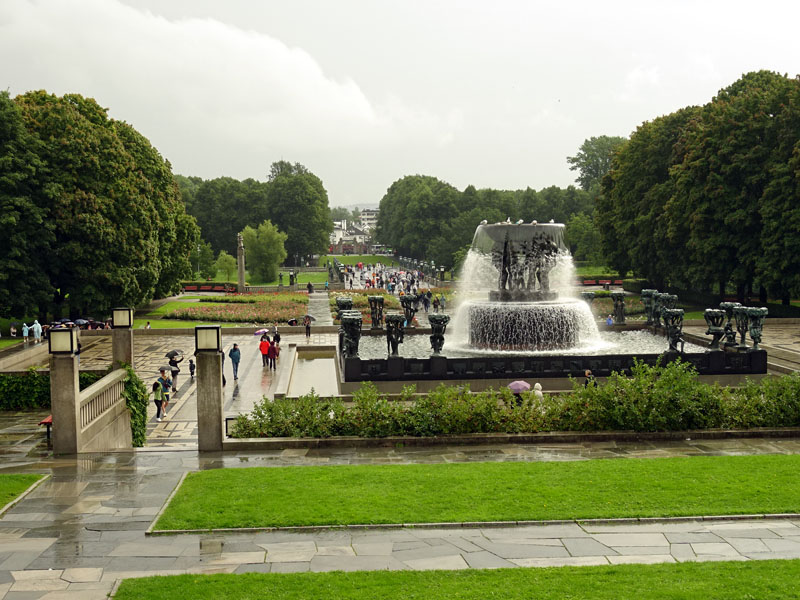 Como terminamos de ver los jardines en torno a las 12, y habíamos reservado para comer a las 15h, decidimos seguir nuestra dirección hasta el parque Frogner, una gran extensión en la que se desarrolla un escenario de esculturas que representan las distintas etapas de la vida humana. Bastante chocante. Allí está la famosa escultura del niño de Oslo, al que, según dicen, si tocas, vuelves.