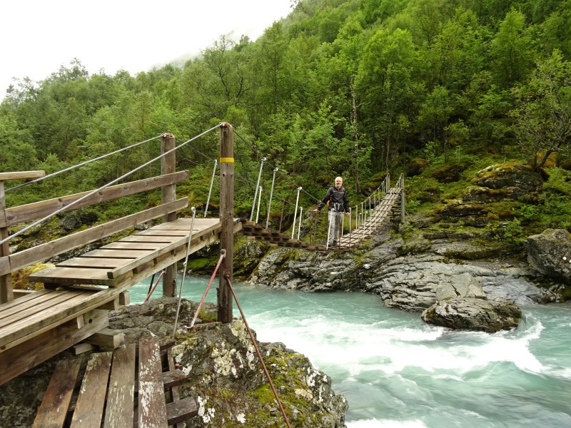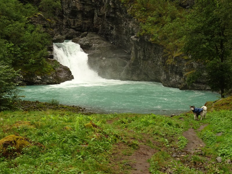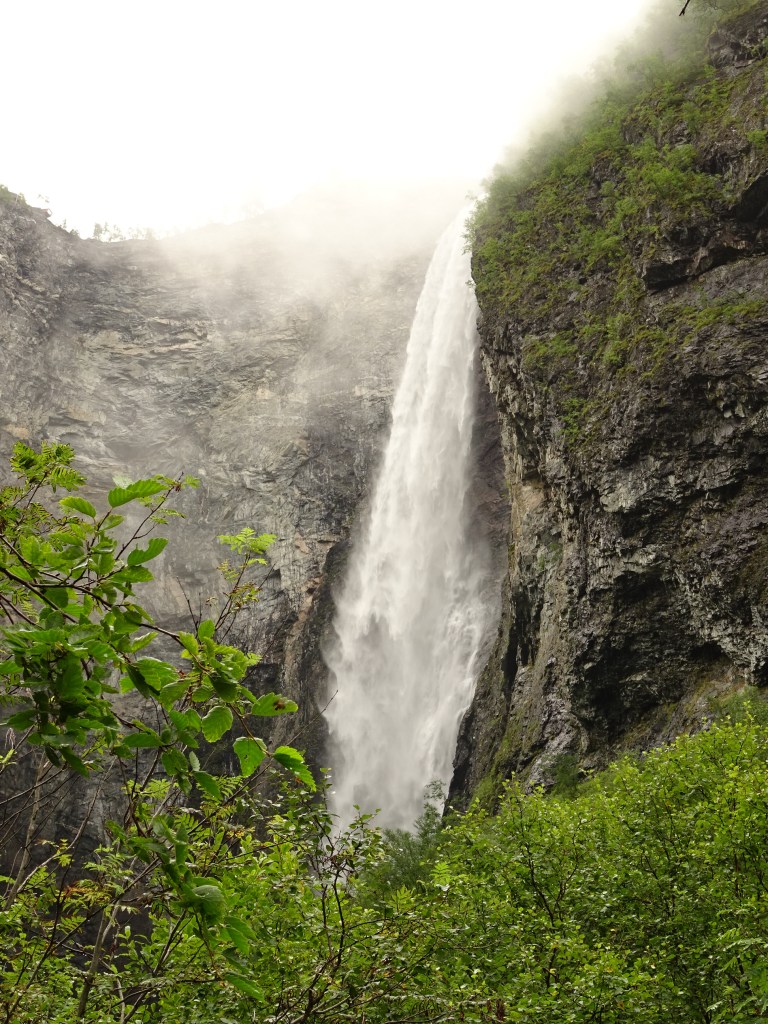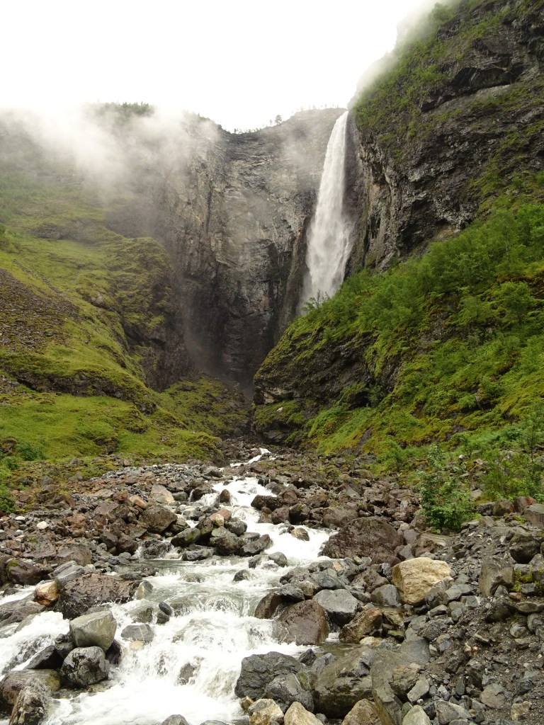 Al llegar a la cascada principal, la Vettisfossen, se te corta el aliento. El sendero te deja lejos, por lo que las fotos están tomadas en la distancia, y la misma formación rocosa te tapa parte de la caída, pero aún así lo que ves impresiona. Los datos: Es la cascada natural más alta de Noruega, con 275 metros de caída. Está protegida desde 1924.