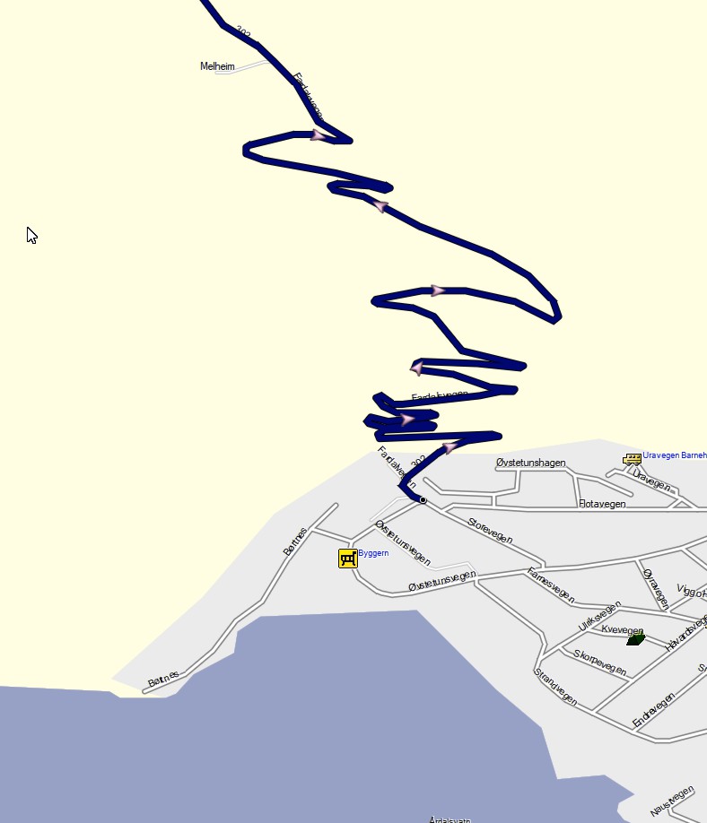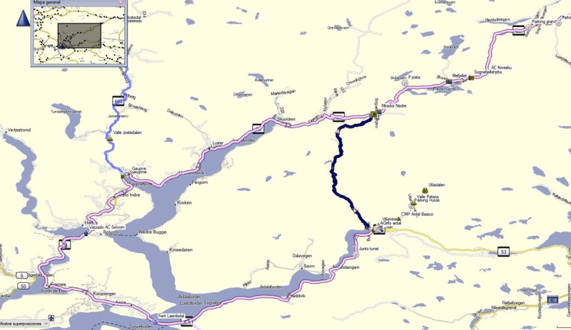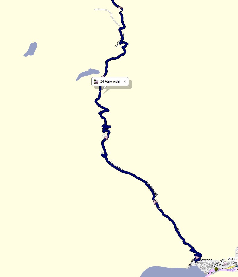 La ruta, como se puede ver, era una suerte de una gran herradura, que te lleva a pensar el buen uso que podían haberle hecho a su famosa tuneladora, pero que nos llevaría a otro ferry para cruzar el fiordo de Ardal, y a un serpenteo que nos haría pasar por pequeños pueblos antes de llegar al mirador de Nedre, en lo alto de una enorme meseta glaciar. Pero no, no hicimos la herradura. La tarde anterior, dando un paseo por Ardal, me fijé en que los coches subían por una carreterilla que serpenteaba ganando altura con rapidez. Buscando en los mapas de Orux-map, que tienen una fuente magnífica para Noruega, descubría que la carreterilla seguía hacia el norte y subía a la meseta de la etapa siguiente. Así que nos dispusimos a explorarla. Lo que no cantábamos es con el trazado, que evita que se pueda acceder con una autocaravana de más de 6 metros, y en esto debo ser muy claro: