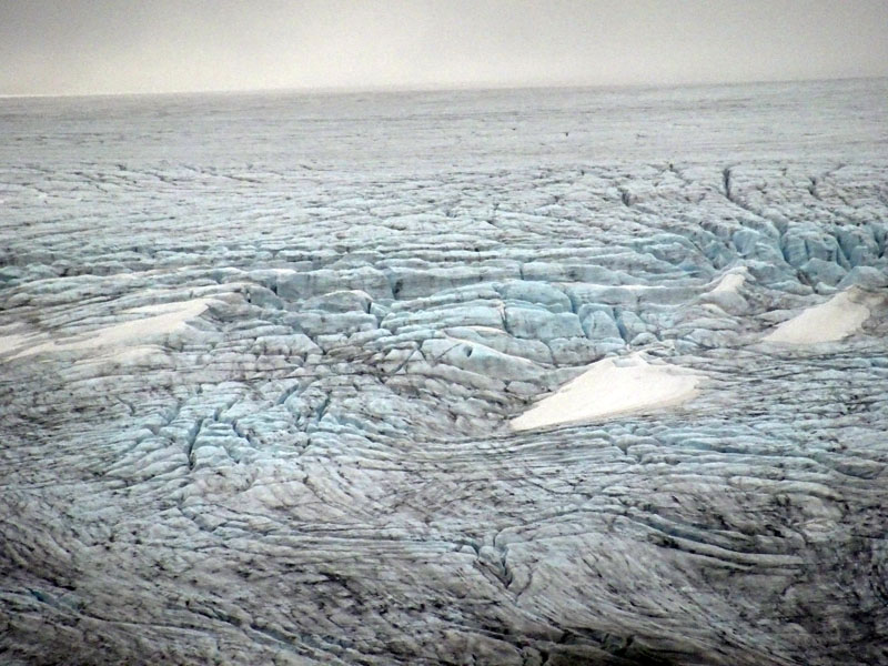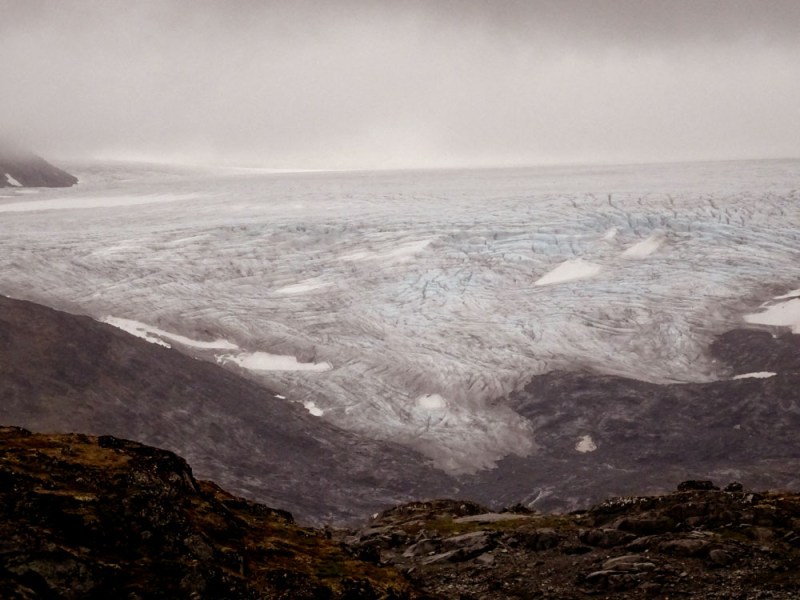 Una vez en la meseta superior, y con el clima de ese día, se te corta la respiración. El paisaje es de alta montaña total. Los glaciares no son una rareza, sino algo que te rodea por todas partes, con tamaños que evocan a los de épocas pasadas, a pesar de que la niebla no te deja ver toda su extensión. Y los lagos, también glaciares, de agua clara por su procedencia, no te continuar avanzar porque sientes que tienes que parar a hacerle fotos a todo. Bendita era digital. Con un carrete de 36 me habría muerto. Aquí va una pequeña muestra:
