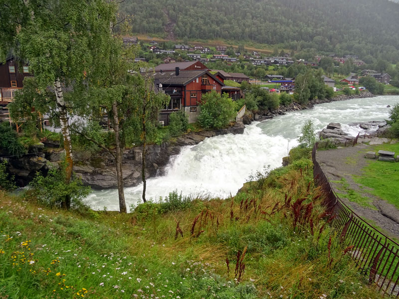 De allí terminábamos la bajada en Lom, donde destaca su imponente iglesia de madera y sobre todo que es punto de partida de diversas actividades en el medio, como se puede ver tanto en el ambiente como en las sucesivas indicaciones por doquier. Pero lo que más nos llamó la atención una vez más fue la fuerza del agua durante aquellos días lluviosos.