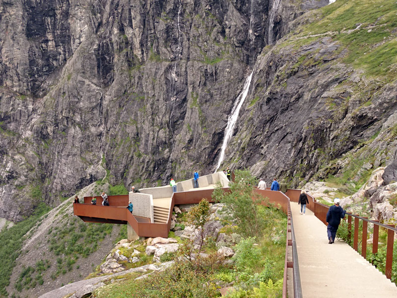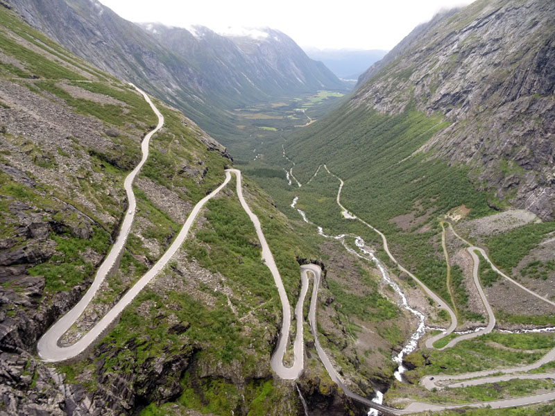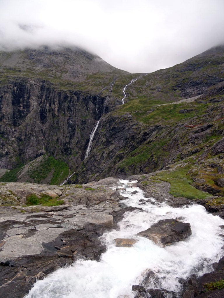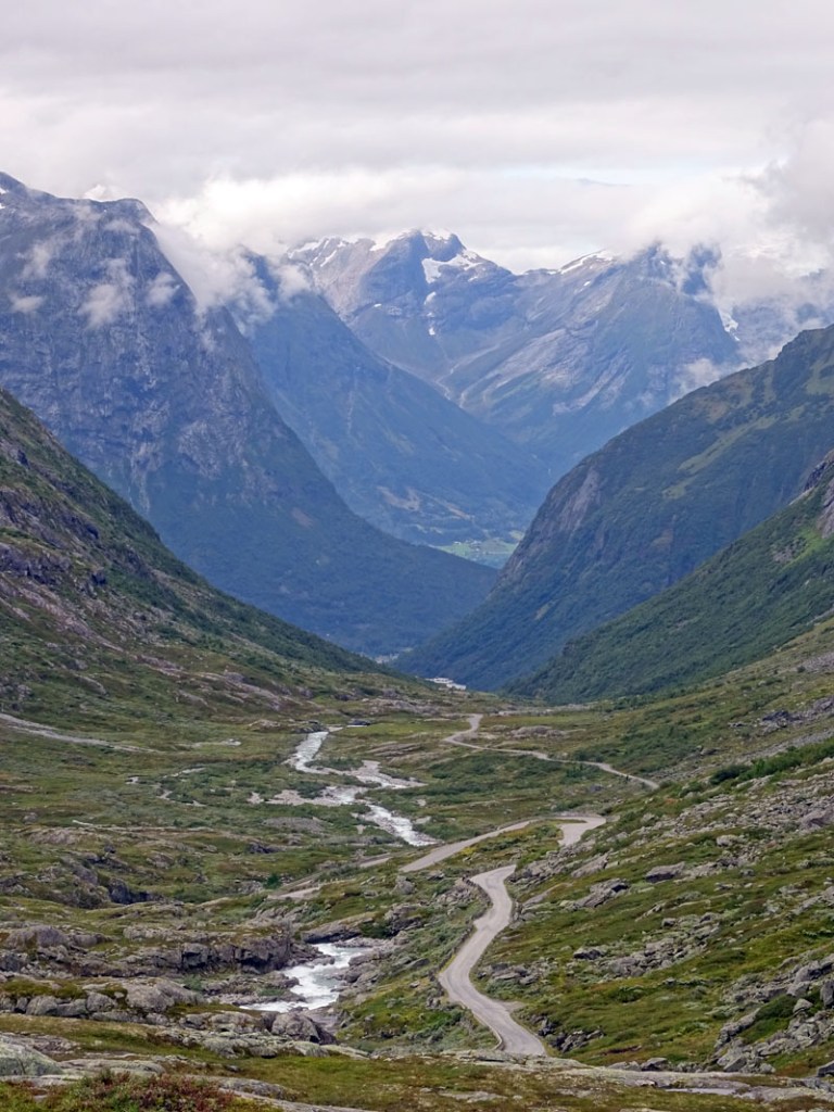 Si te fijas bien, en la primera foto de esta tanda de tres, verás al fondo del fiordo a la derecha una carretera en zig zag. Efectivamente, cuando la vi en directo pensé «seguro que es por allí», y poco me equivocaba. Ella nos elevaría a otra zona de montaña preciosa por la que dimos un paseo descubriendo ese bonito puente de piedra, y por la que seguimos nuestra ruta tras bajar y cruzar en ferry en Eisdal, en dirección a la famosa carretera del Troll, que se convertiría en el postre del día más completo del viaje.
