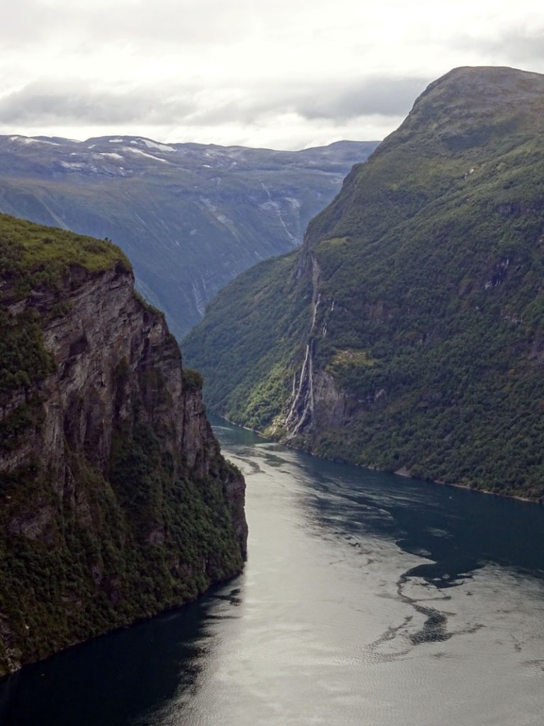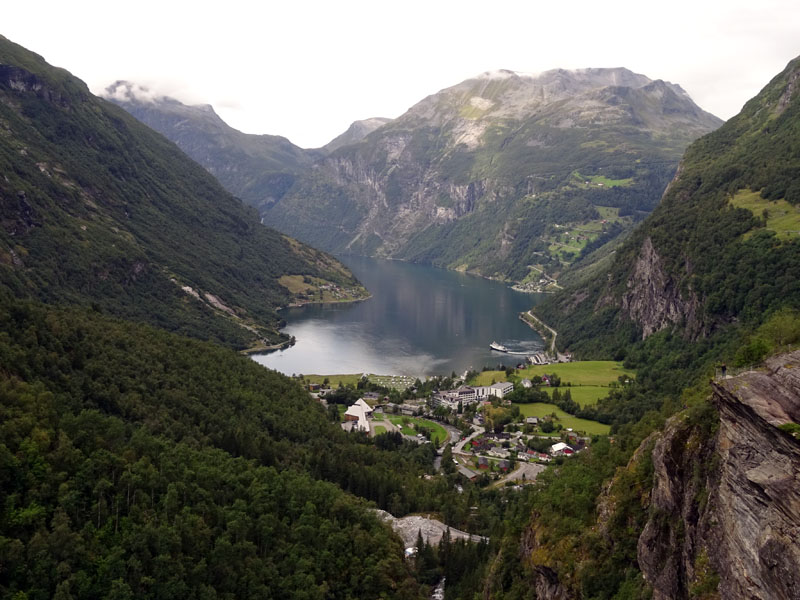 Con esas vistas decidimos parar a comer. Ahora tocaba caer en el fiordo Geiranger, no sin antes asomarnos al mirador Flydalsjuvet, desde donde a veces se muestran fotos turísticas con un crucero incrustado en el pueblo que da nombre al fiordo.