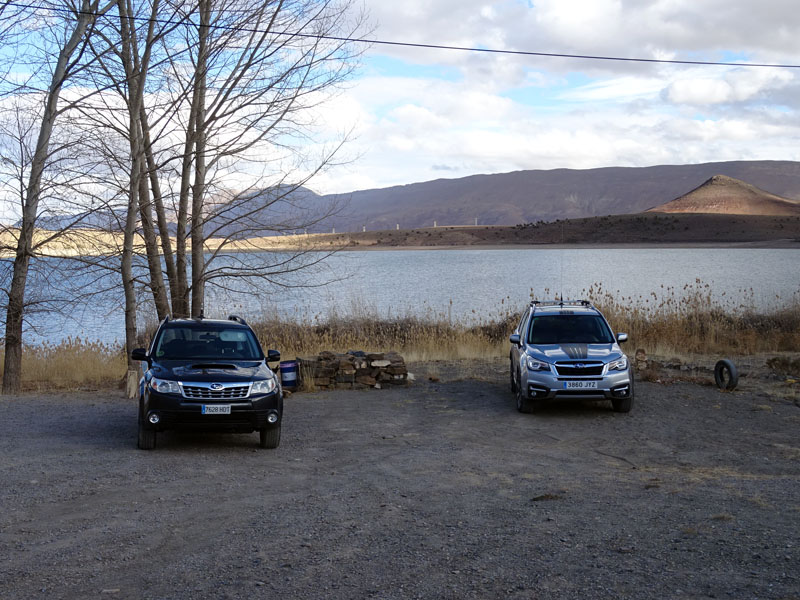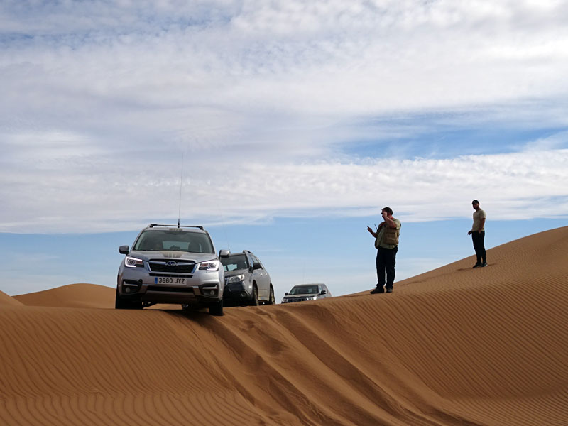 Así se explica que estuviésemos más tiempo atrancados que en marcha. A la hora de comer paramos desfallecidos, y tras coger fuerzas en el picknick nos quedaba intentar salir de allí. Pero las dunas alargadas nos iban dirigiendo a su antojo cuando intentábamos seguir las zonas duras que quedan entre ellas en busca de salida. Hasta que incluso nos separamos en dos de esas zonas, cuando atardecía, de manera que las horas sin luz hasta salir de allí las hicimos en dos grupos. Ni que decir tiene que nos hartamos de darle a la pala, nuestra única aliada cuando no había quien nos diese un toroncillo. Incluso tuve un vuelo en la oscuridad por un error de coordinación entre Ana y yo, que me mejoró un par de grados el ángulo de ataque del Subaru…