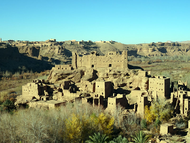 Al norte de Zagora tomábamos nueva pista entre palmeras que nos mostraban lo que tuvo que ser una fértil zona de huertos antes de que aquello se secase. Luego, piedras. Muchas piedras, sin un paisaje que mereciese la pena meterse por allí. Pero fuimos avanzando poco a poco hasta tomar de nuevo asfalto en Ait Tajer.Y tras un pequeño trayecto por la RR 108, cogimos al Norte la pista del Sahro más al Oeste y de la que nos quedaba un tramo por explorar, hasta caer en el track del año pasado, que no recordábamos para nada, ya que se suponía todo de pista rápida y lo fue solo en un pequeño tramo. A oscuras y cantándonos por la emisora seguimos hasta nuestra meta, El Kelaa, donde hubo que buscar un poco el alojamiento en mitad de un mar de kasbah derruidas. Eso sí, mereció la pena, porque el sitio es como para echar dos noches allí. Chez l´Habitant. Muy bien atendido y cuidado por una familia sonriente desde el mayor hasta el más joven, habitaciones amplias y limpias, y un enclave bastante fotogénico.