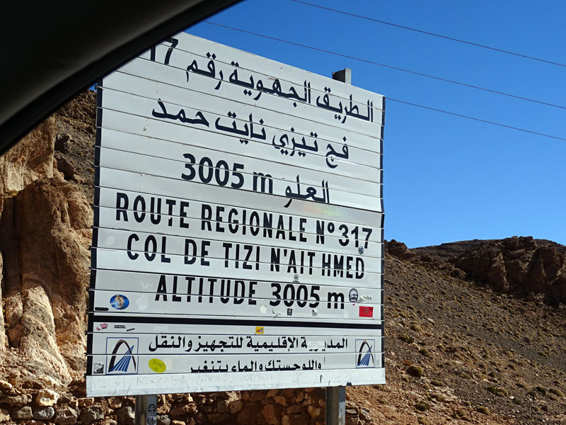 Salimos por el Tzi´n Tichka hasta Agouim. Lo han ensanchado con 2 carriles de subida, por lo que no hay que estar pendientes de las emisoras para adelantar. Menos mal, porque el tráfico de Prados de alquiler era bastante denso. Casi nos cuesta parar para la preceptiva foto, pero tuvimos la suerte de que unos se iban cuando nosotros llegábamos. Después, el primer tramo de pista nos acercaría a Taliouine, donde paramos en el Albergue le Safran. Un sitio amplio donde la decoración daba a entender que tuvo tiempos más «gloriosos» antes de que el uso le fuese dejando huella en forma de desgaste, pero aun digno para un final de jornada. El mapa de la recepción da también muestras de ser un punto de partida para senderos por la zona, algunos por encima de los 3000 metros.