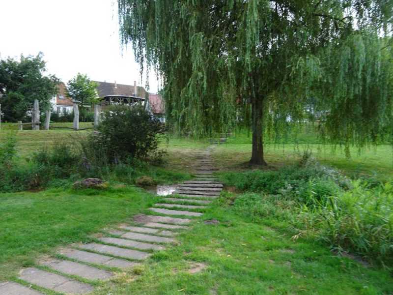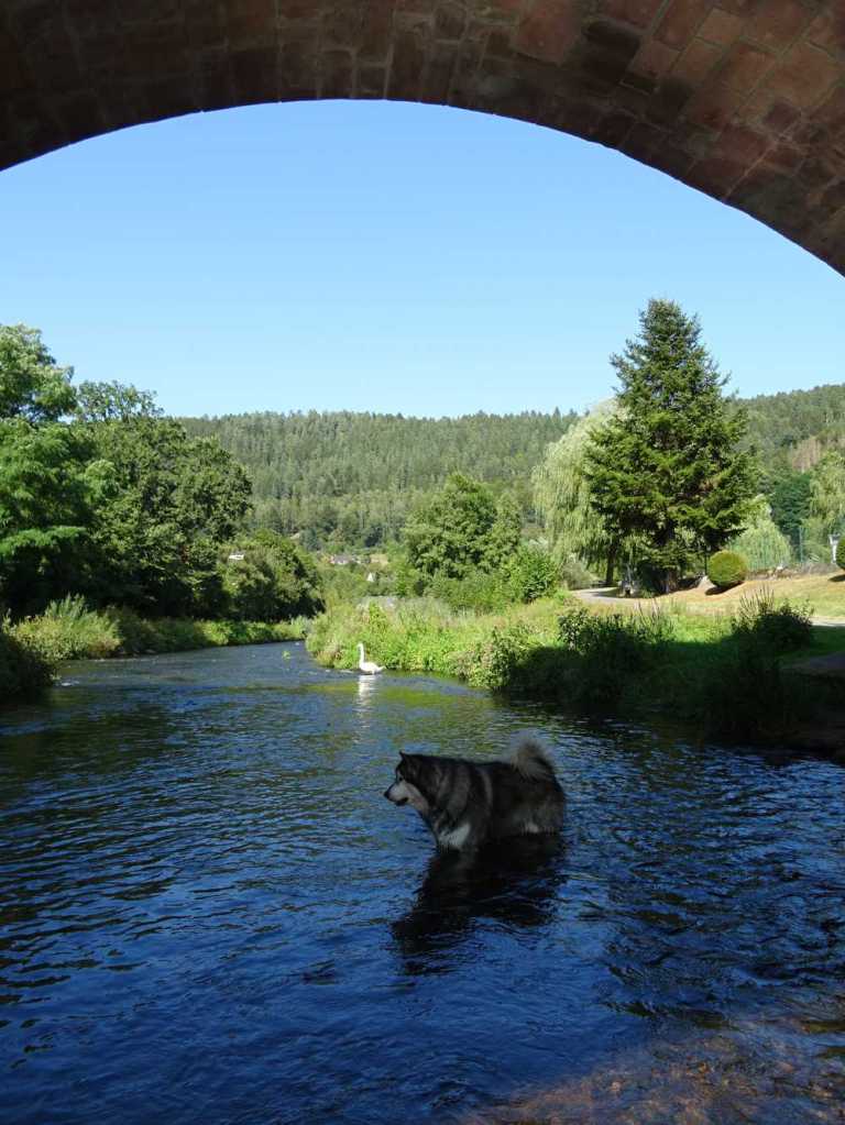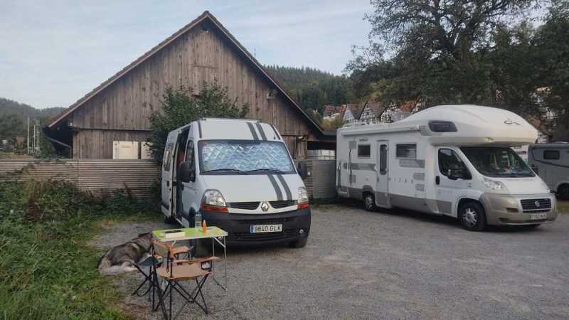 Justo al norte de Cawl está Hirsau. Cambiar de área de AC fue casi como cambiar de aparcamiento en una ciudad. Lo bueno es que en este caso pillamos el área con buen sitio y a falta de sombra, un rio al lado para combatir el calor, salpicado de sauces. La zona de vaciado es bastante económica pero está muy en pendiente, cuestión de maniobrar algo.
