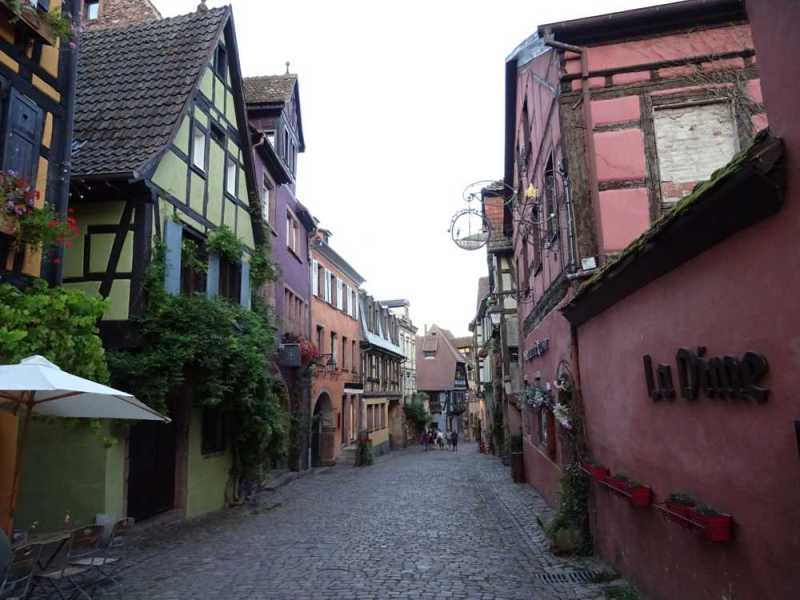 Riquewihr es una de esas ciudades alsacianas en las que parece haberse detenido el tiempo en el medievo. Aunque para ser justos, todo está tan limpio, cuidado y decorado que dudo que en el mismo medievo fuese tan agradable pasear por sus calles. Además, lo pillamos en fiestas, y sus habitantes se reúnen en carpas en una especie de verbena en la que comparten grandes mesas y barbacoas para degustar productos regionales. Otra cosa llamativa de las coloridas fachadas son los carteles de metal de los distintos oficios.