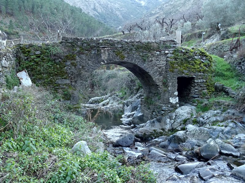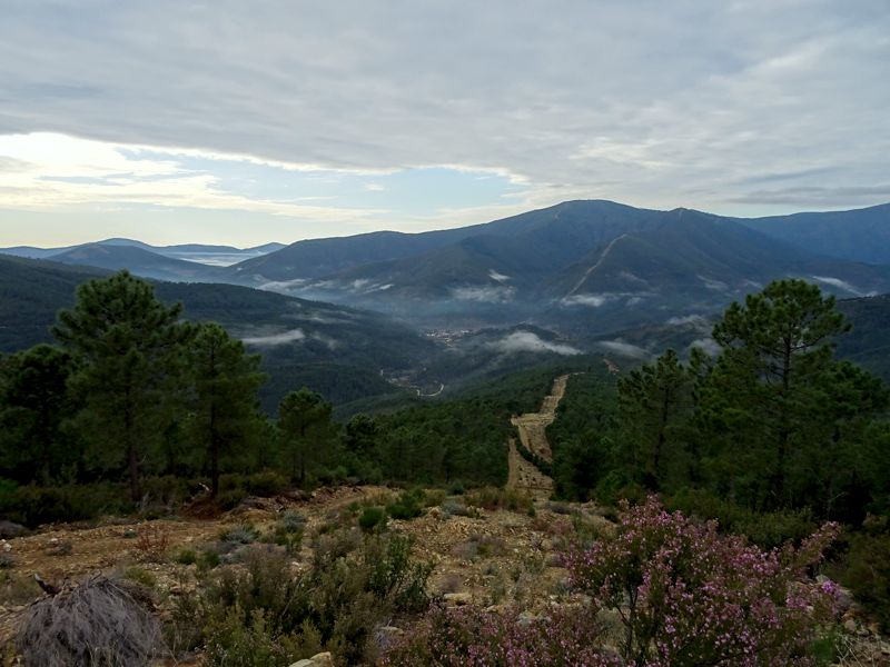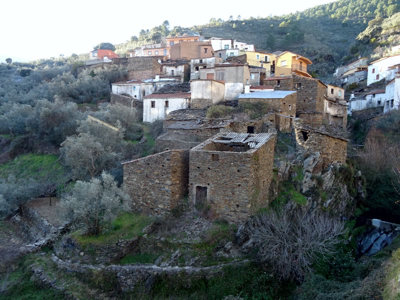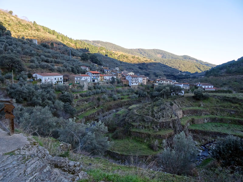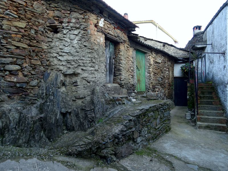 Gracias a la división del trayecto, cubríamos la mitad que nos quedaba en la mañana del 31 hasta Huetre antes de la hora de comer, uniéndose a nosotros el gran Carlos, y disfrutábamos de un cocido sin igual ya calentitos en el centro de operaciones. Esto… «Hu-qué?» Bien. Las Hurdes es una zona muy al norte de Extremadura que tiene bastantes características que la hacen única. Por un lado el mismo enclave, de por sí muy espectacular geológica, biológica y paisajísticamente hablando. Pero por si fuera poco, jalonada por la Sierra de Francia y las Batuecas. Además, está muy cerca y al Norte de Plasencia y el Valle del Jerte. Es decir, hay hectáreas y hectáreas de monte para recorrer y disfrutar de la naturaleza. Por otro lado es una zona perteneciente a la «España vaciada», lo que propicia una densidad de población bajísima, y que sea un lugar ideal para desconectar y alejarse del bullicio. Además, es relativamente húmeda, por lo que encontramos varios ríos y arroyos, bosques, el gran embalse de Gabriel y Galán… Por último, y dando testimonio de que no siempre estuvo tan despoblada, Las Hurdes están llenas de pueblecitos y aldeas que en invierno se quedan tranquilos pero en verano se llenan de «los que regresan». Y es que en cualquiera de estas aldeas la población a principios del siglo pasado multiplicaba por 10 la actual, vaciándose a medida que las comunicaciones con el exterior mejoraban y la gente joven veía la oportunidad de hacer dinero en el extranjero. Hubo de este modo una fuerte emigración a Suiza, Alemania y Francia que dejaba a las mujeres al cuidado de los hijos, los huertos y los rebaños durante 8 meses al año. Charlar de todo esto con lugareños es un deleite que nos ayuda a comprender mejor la historia de aquellas partes de nuestra tierra, en las que la vida era mucho más difícil de a lo que estamos acostumbrados en la actualidad. En estas pasó delante de nosotros una abuelilla muy encorvada pero con visibles ánimos y una sonrisa sincera. «Esa es la mas vieja del pueblo. Tiene 92 años, y era pastora. Tenía más de 300 ovejas y las llevaba ella sola». Cuántas historias podría contar…
