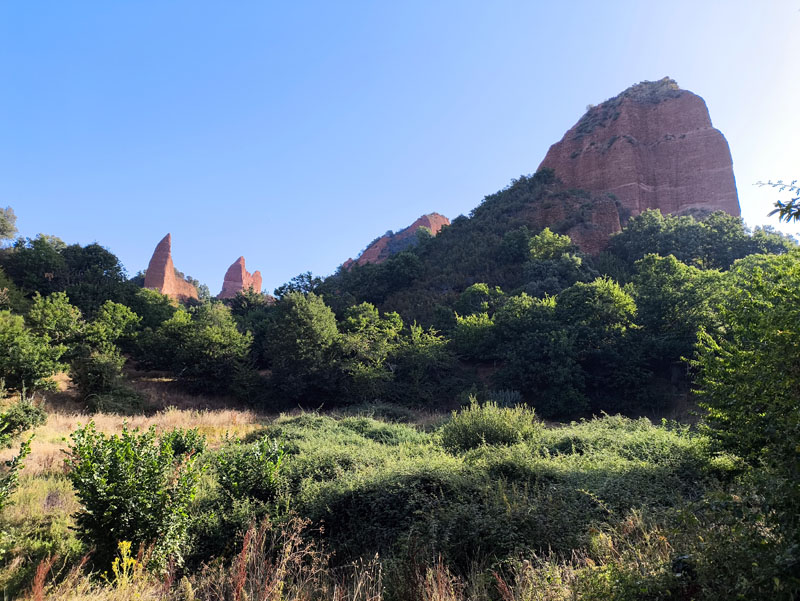 Después de una mañana fresquita nos desplazamos hasta Las Médulas e hicimos uno de los recorridos sencillos, que no obstante entra en el corazón de esta curiosa explotación minera del pasado. Es muy curioso el contraste entre la tierra arcillosa, roja, y la vegetación.