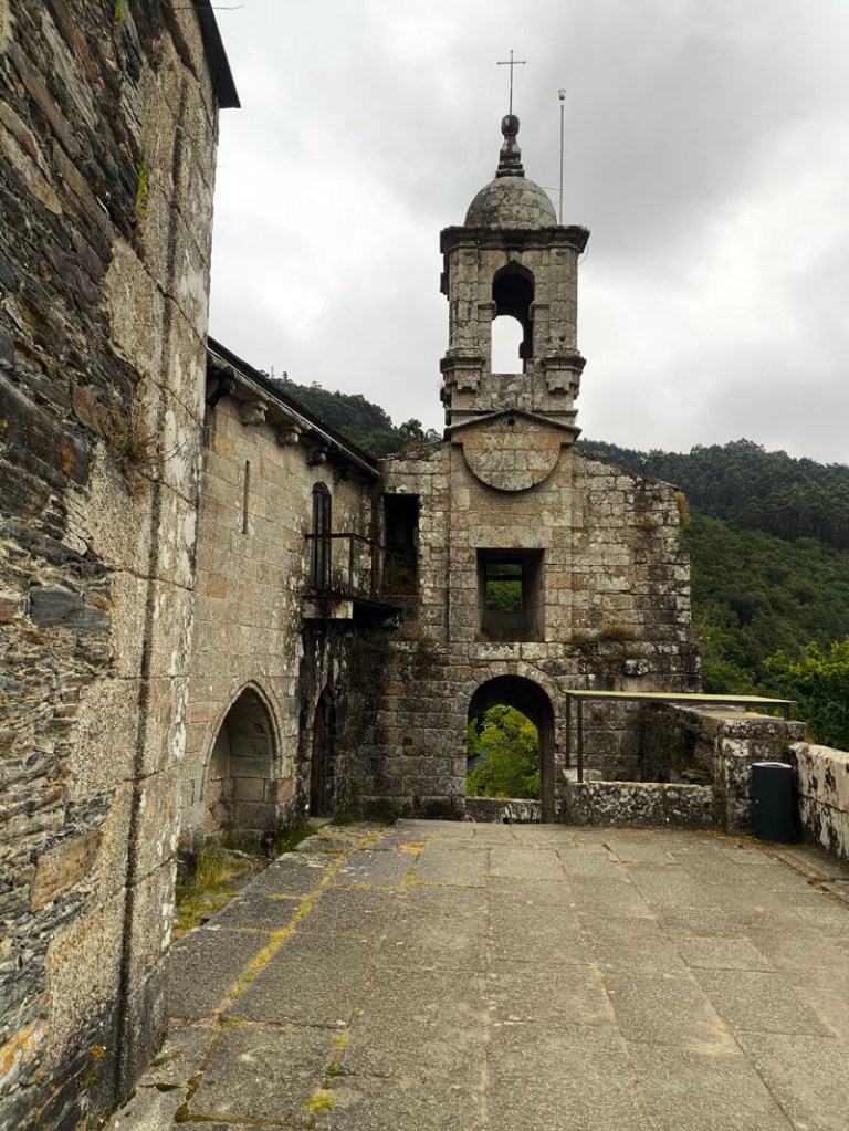 La mencionada ruta, llega hasta el Monasterio de S Joan de Caaveiro, visitable, y con unas vistas espectaculares. Allí repusimos fuerzas, todos.